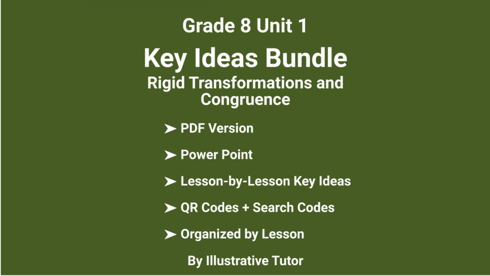 Grade 8 Unit 1 – Key Ideas Bundle "Rigid Transformations and Congruence" (PDF + Power Point + QR Codes & Video Search Codes). Help your students understand every lesson in Unit 1 of Illustrative Mathematics Grade 8 with this easy-to-use teaching companion. This bundle includes: • PDF and Power Point • Clear, student-friendly Key Ideas for all 17 lessons • Organized by lesson for fast reference • QR codes + Search Codes to matching video tutorials • Created by Illustrative Tutor with classroom and independent learners in mind. Perfect for teachers, tutors, and homeschoolers who want clear explanations and easy access to resources. 🎓 Teach smarter. Review with confidence. Download now.