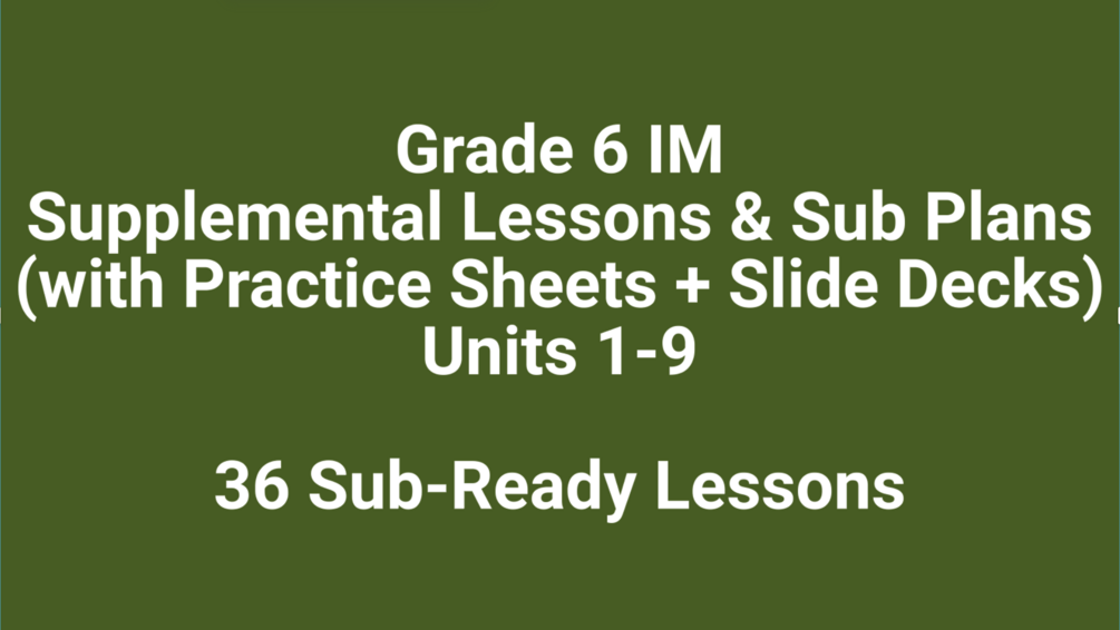 This all-in-one bundle features 36 supplemental, single-period lessons designed to support Units 1–9 of the Grade 6 Illustrative Mathematics curriculum. Each lesson includes a sub-friendly lesson plan, student practice sheet, and guiding slide deck—requiring zero prep or setup. With clear objectives, warm-ups, step-by-step examples, independent practice, and exit tickets. This bundle is perfect for reinforcing core concepts, catching up on missed instruction, or providing high-quality substitute coverage throughout the year.
